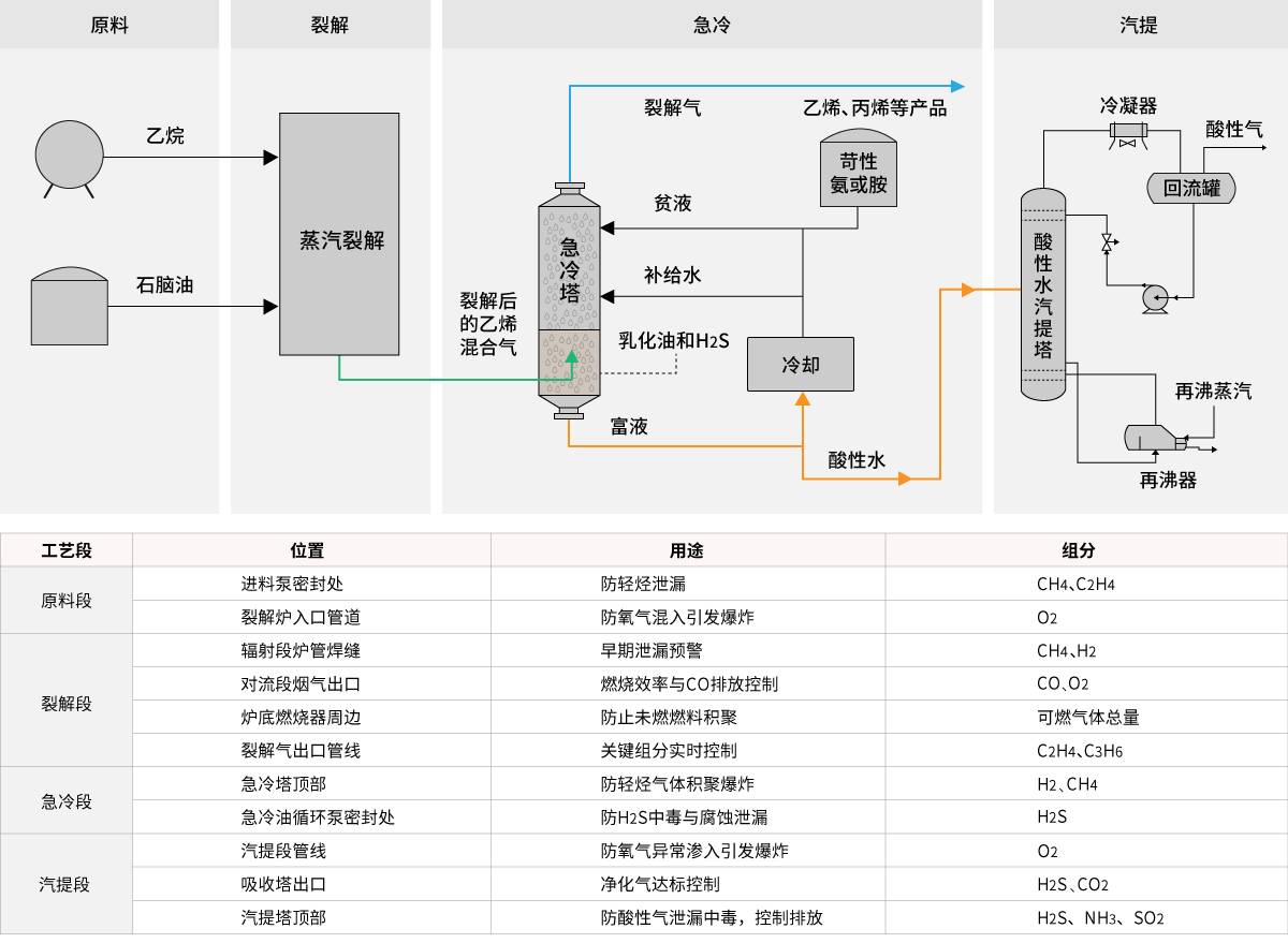 乙烯裂解技術(shù)作為現(xiàn)代石油化工的核心與基石,能夠?qū)⒁簯B(tài)烴類在高溫高壓下轉(zhuǎn)化為高附加值烯烴與芳烴,這一過程是生產(chǎn)合成樹脂、高端纖維等關(guān)鍵材料的源頭環(huán)節(jié)。裂解裝置工藝作為全產(chǎn)業(yè)鏈的安全咽喉要道,其過程氣體的精準監(jiān)測直接決定生產(chǎn)命脈。通過實時追蹤從800℃烈焰到-100℃深冷中的組分變化,不僅能優(yōu)化裂解深度提升雙烯收率,更能提前阻斷氫氣燃爆、硫化氫中毒等致命風險,為萬億級石化產(chǎn)業(yè)的本質(zhì)安全與低碳轉(zhuǎn)型構(gòu)筑不可逾越的防線。
